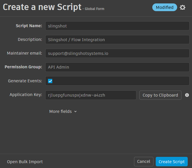 Script Name: slingshotDescription: Slingshot / Flow IntegrationMaintainer email: support@slingshotsystems.ioPermission Group: leave at default (API Admin)Generate Events: checked- make note of