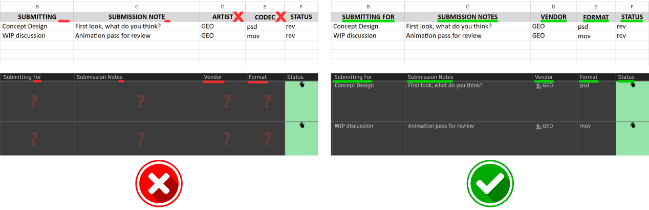 Column header names must match Field names in Shotgrid/Flow exactly, case-insensitive.