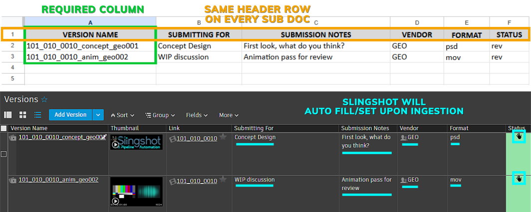 Slingshot can import metadata from vendors' submission documents straight to Shotgrid/Flow. Vendors simply include their spreadsheet in their submission packages, and Slingshot handles the rest.